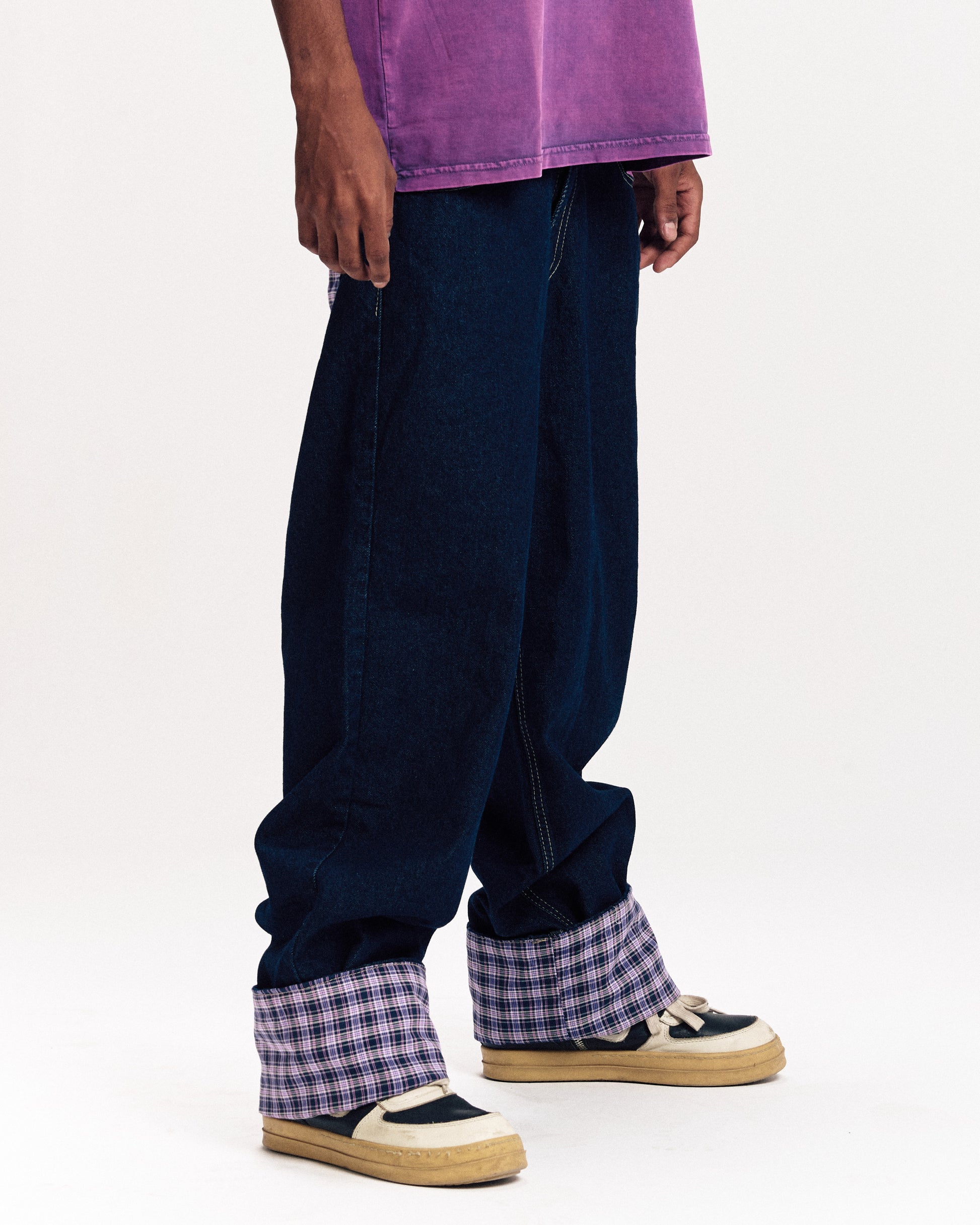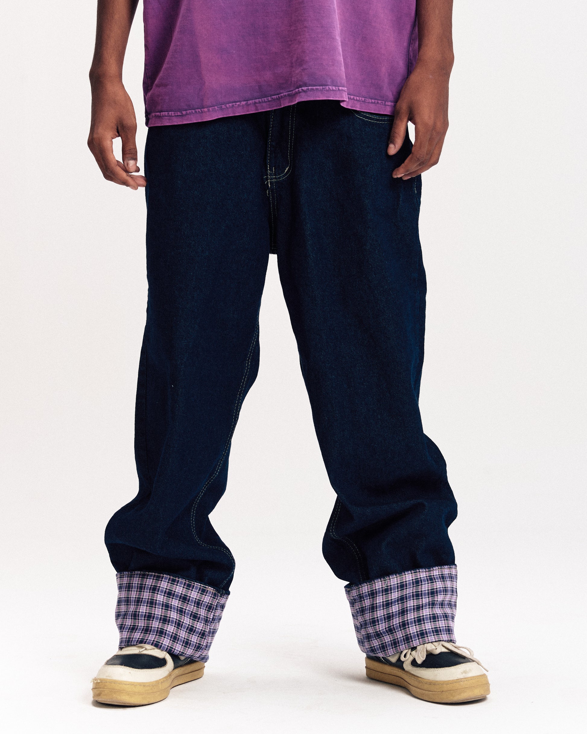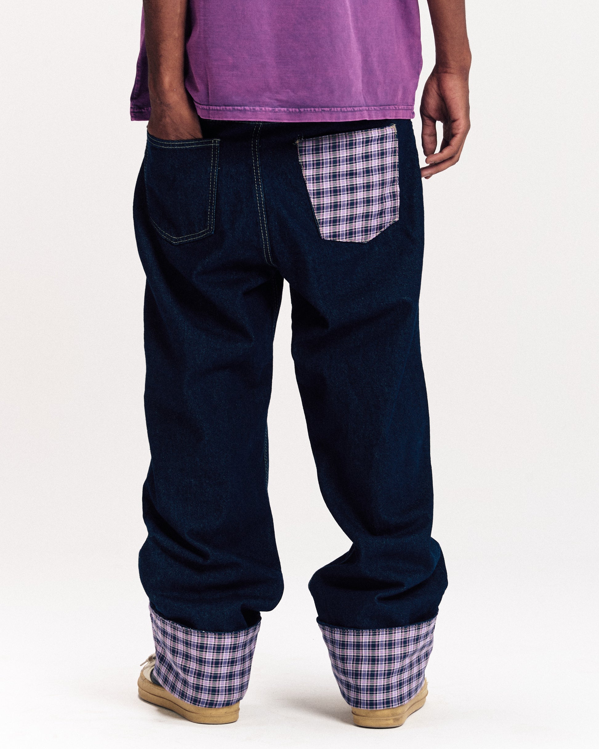 Raw unisex Denim with plaid fabric on the back pocket and foldable in the leg openings.